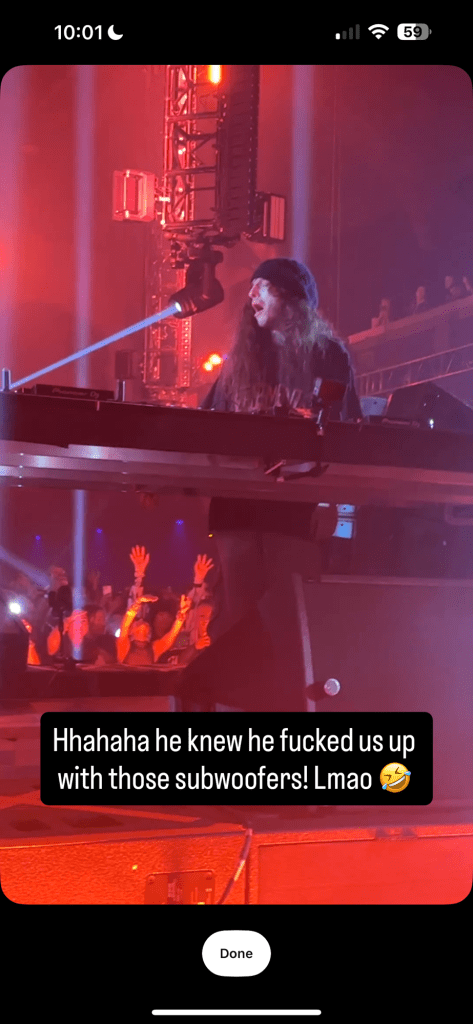 Production: Lasers and visuals were consistent, but the room’s mood overshadowed the show design. When pockets of the crowd were arguing or shoving, those moments broke immersion.