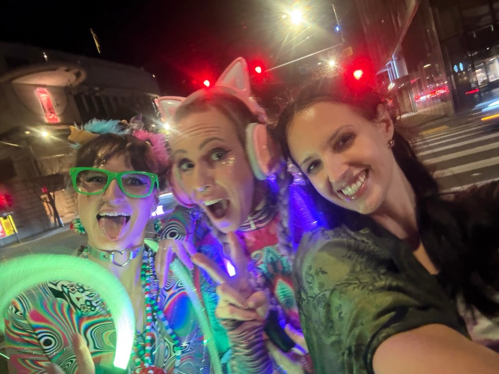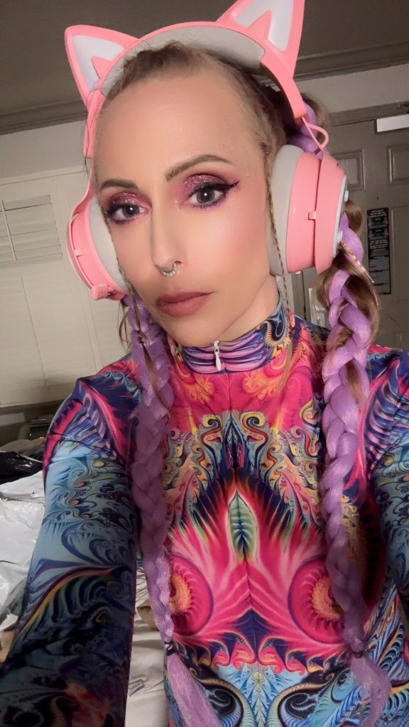 My flowwhip is a river of sparks, cursive light uncoiling from my wrist— and my bodysuit blooms like a second dawn, color on color, skin of kaleidoscopes.